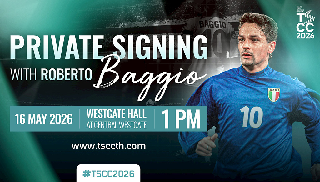ประกาศแล้ว! ไฮไลท์สุดพิเศษของงาน Thailand Sports Collectibles Convention 2026 (TSCC’26) ที่จะจัดขึ้น 2 วันเต็ม ในวันที่ 16-17 พฤษภาคม 2569 กับโอกาสหาได้ยากที่จะพบตำนานฟุตบอลระดับโลก “เทพบุตรเปียทองคำ” โรแบร์โต้ บาจโจ้ ผู้คว้ารางวัล Ballon d’Or ปี 1993 ในการมาเยือนเมืองไทยอย่างเป็นทางการครั้งแรกในรอบ 30 ปี พร้อมกิจกรรม Meet and Greet สุดพิเศษที่จะมีแฟนบอลเพียง 250 คนเท่านั้นที่จะได้ถ่ายภาพ 1:1 และรับลายเซ็นบนผลงานศิลปะสุดเอกซ์คลูซีฟ ภายในงานนี้เท่านั้น